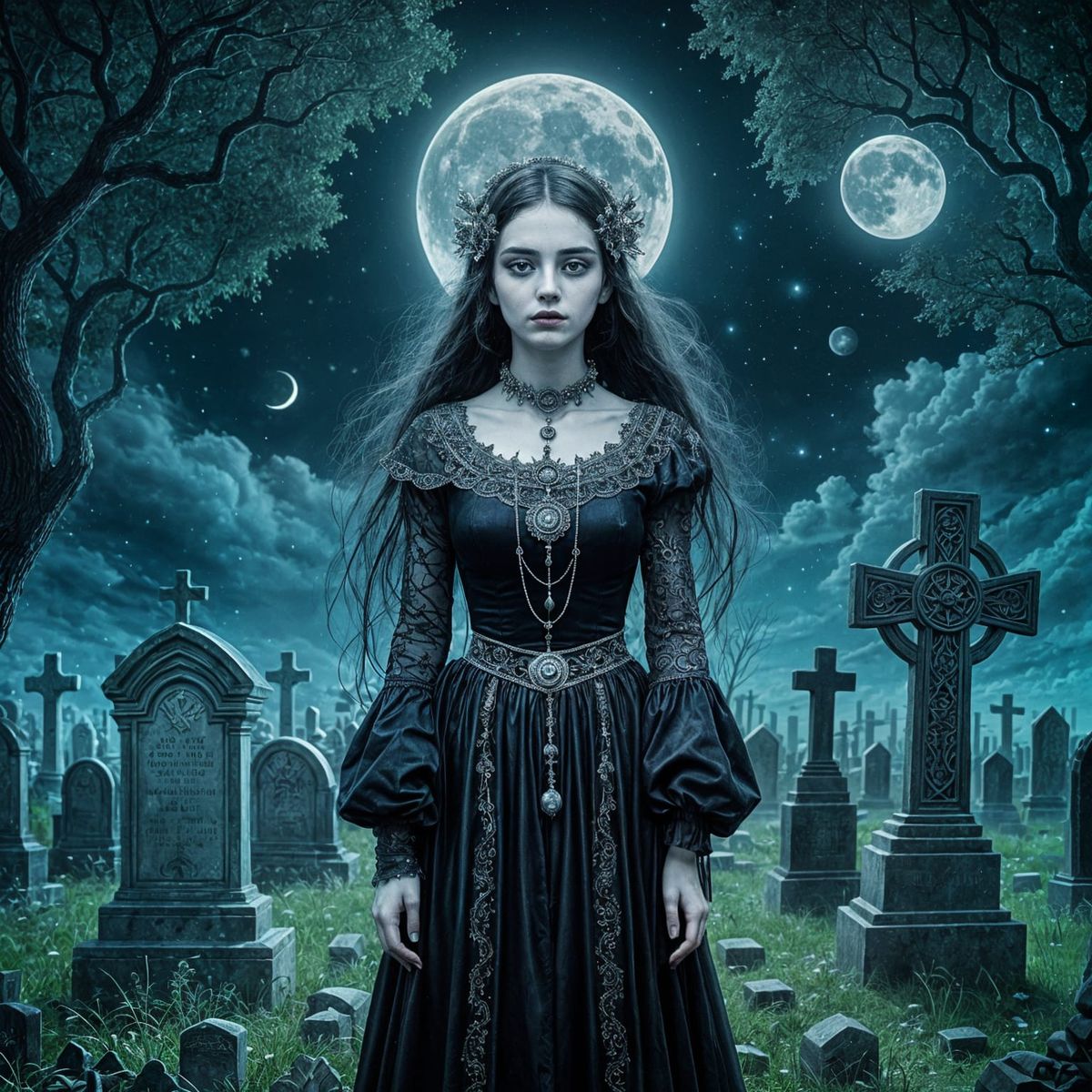 This image shows a mystical gothic woman in a haunting moonlit graveyard scene, with intricate details and an otherworldly atmosphere reminiscent of medieval religious art and avant-garde pop surrealism.