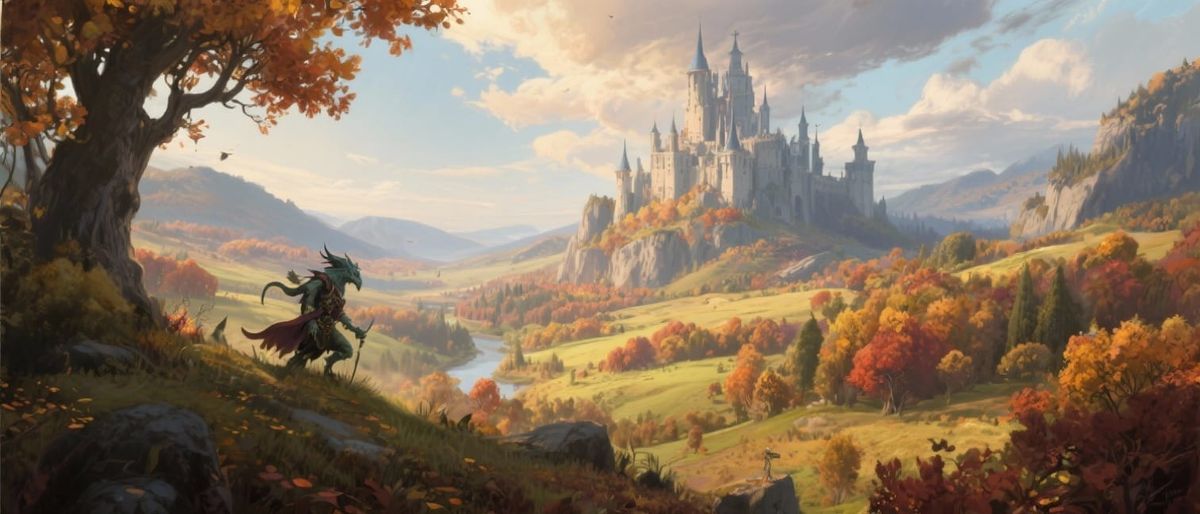 A digital painting of a vibrant autumn landscape featuring a majestic castle floating high in the sky. The artwork evokes a sense of fantasy and wonder.