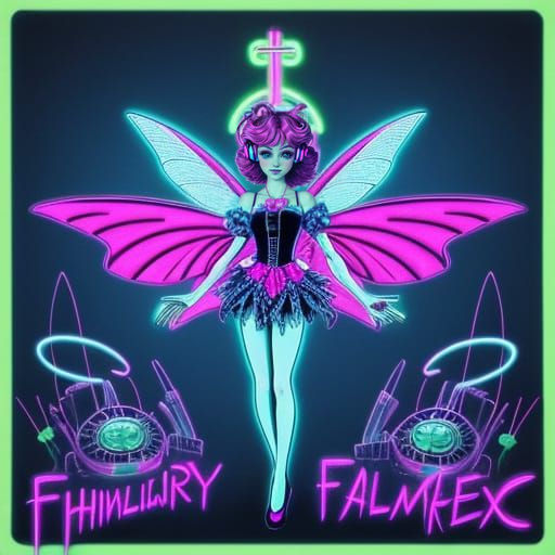 This image depicts a whimsical fairy bathed in synthwave neon light. The fairy is set against a retro backdrop, creating a vibrant and magical scene.