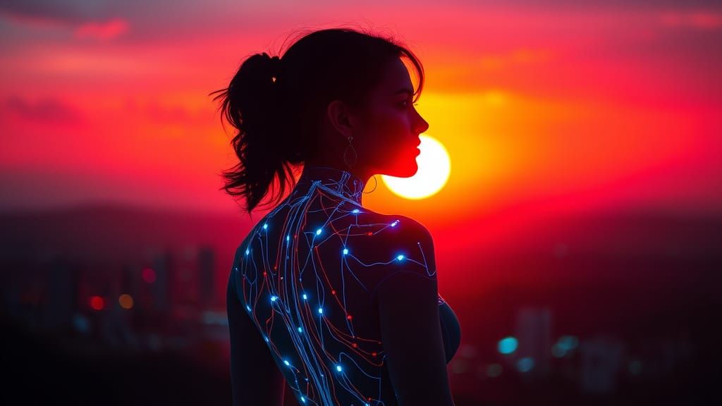 This image is a digital artwork featuring a woman's silhouette against a vibrant sunset backdrop, with a transparent body adorned with neon circuit-like points, blending futuristic and neon-lit elements