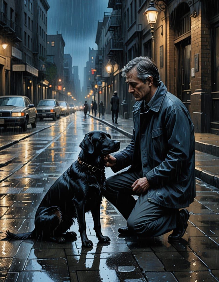 This image shows a child kneeling with a dog on a rain-slicked city street. The scene is rendered in an ink wash style, with bold brushstrokes, chiaroscuro lighting, and cool blue hues to evoke a sense of melancholy.