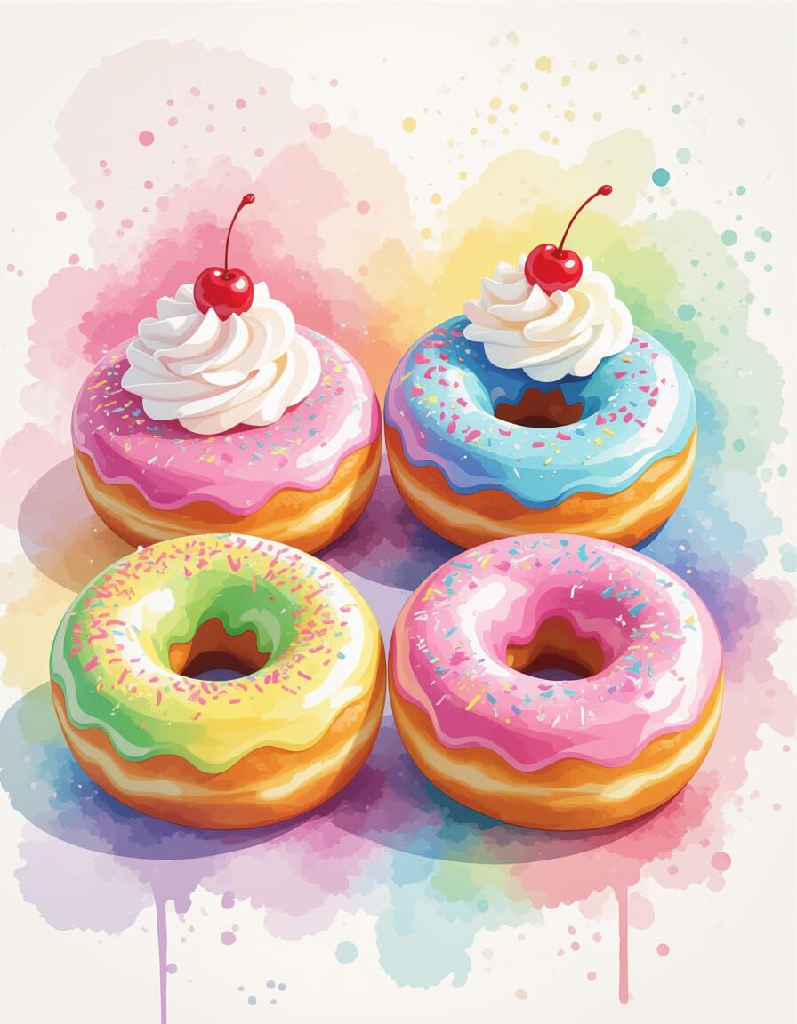 A vibrant assortment of donuts with colorful toppings and rainbow accents. The whimsical watercolor art style features soft brushstrokes and blended edges.