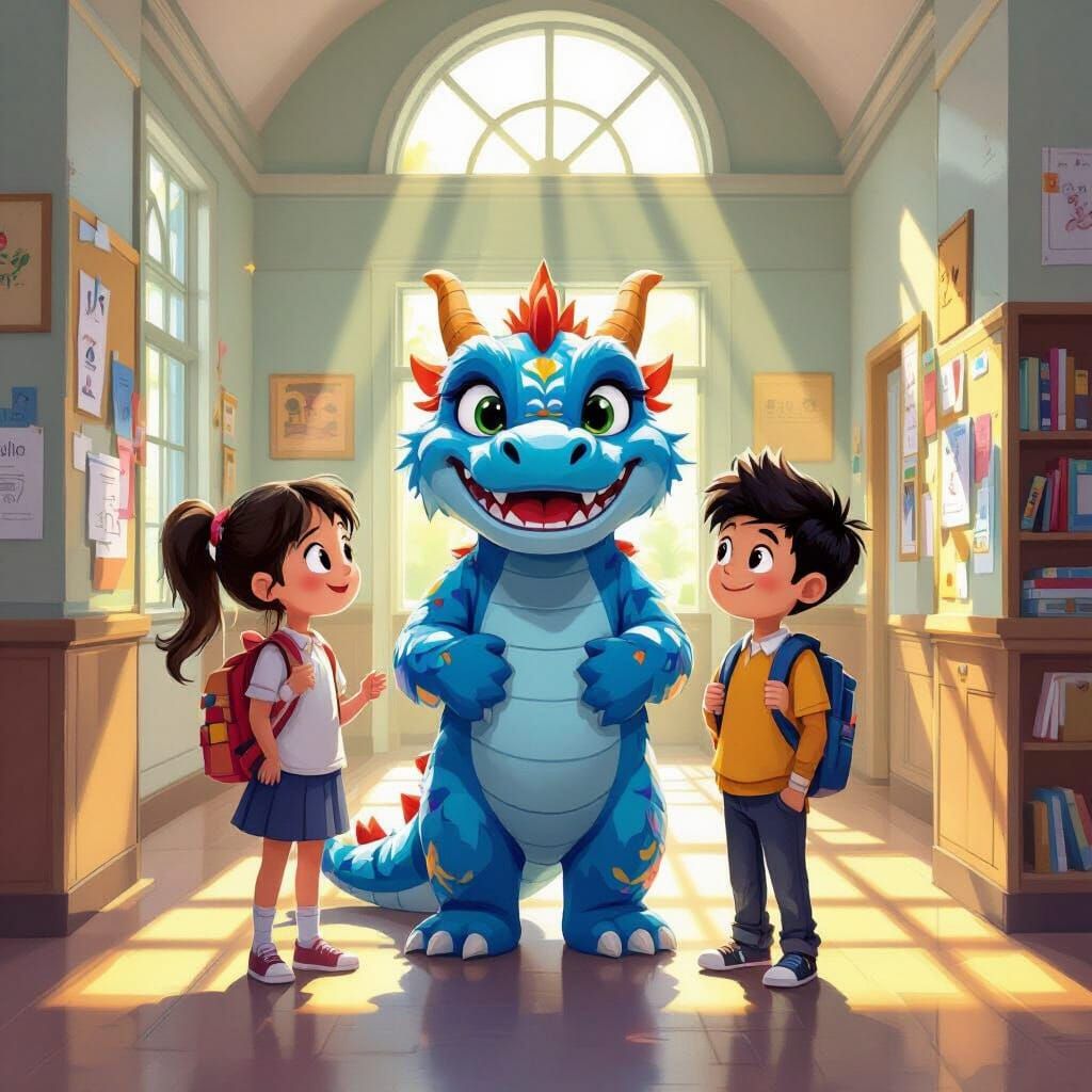 A children's book illustration shows three determined fifth graders searching an elementary school hallway for a missing blue dragon mascot. The scene features warm morning light and bright, optimistic colors.