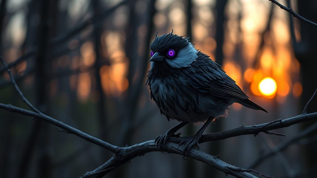 A striking picture of a chickadee made of sticks, perched on a branch in a forest at sunrise. The image blends dark, mystical elements with atmospheric lighting and organic textures.