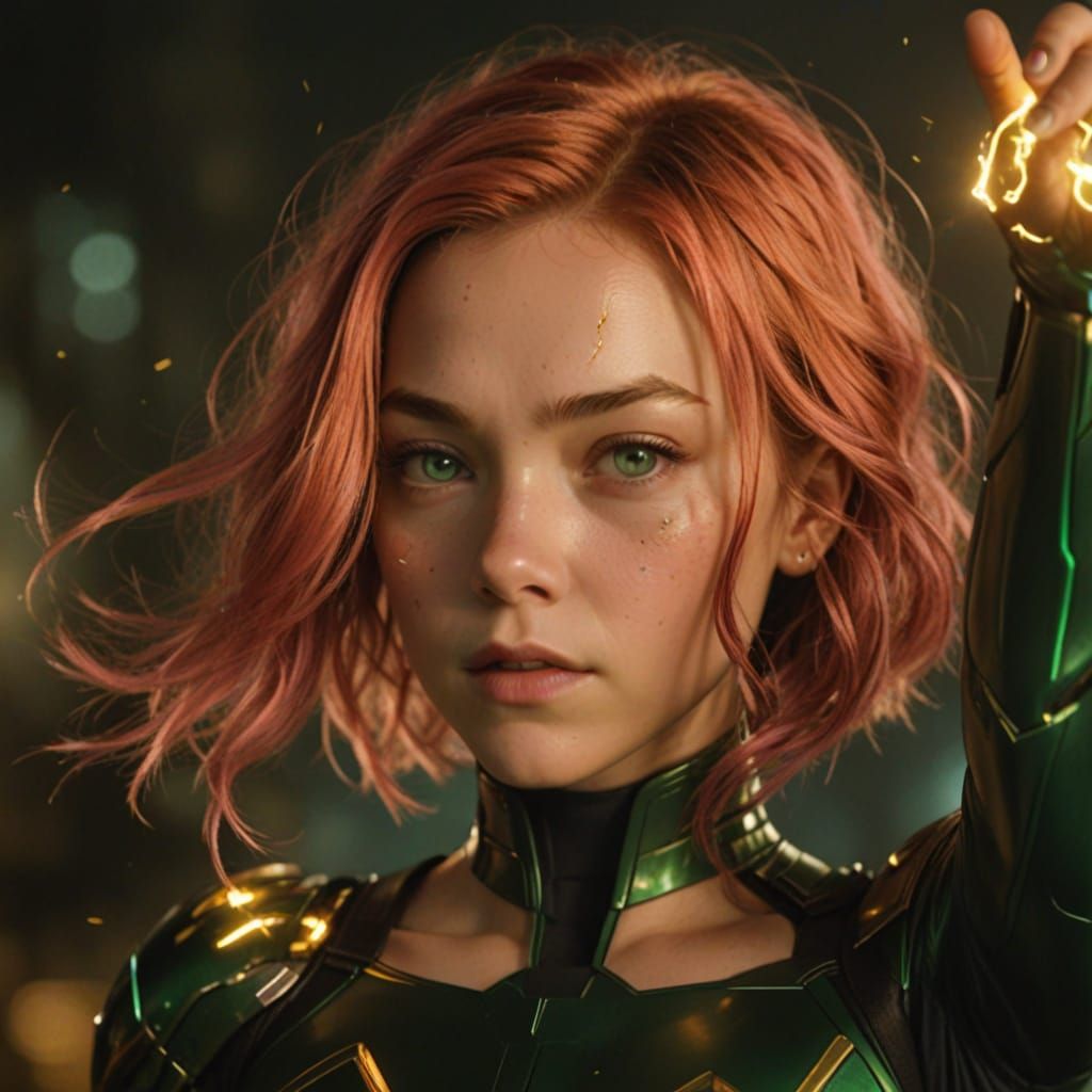 A concept look for actress Jayden Bartels with green hair and the power to manipulate magnetic fields and metals, as Polaris, Mistress of Magnetism, from Marvel's X-Men universe.