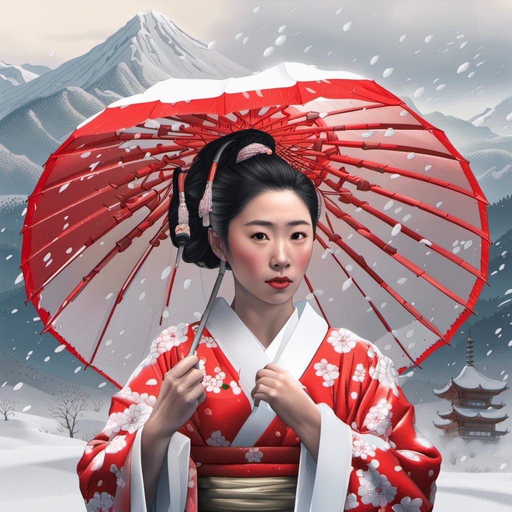 This image shows a woman in a traditional kimono holding a wagasa umbrella. The background is filled with snow, a red Japanese pagoda, and white mountains. The image has a hyperrealistic, splash art aesthetic.