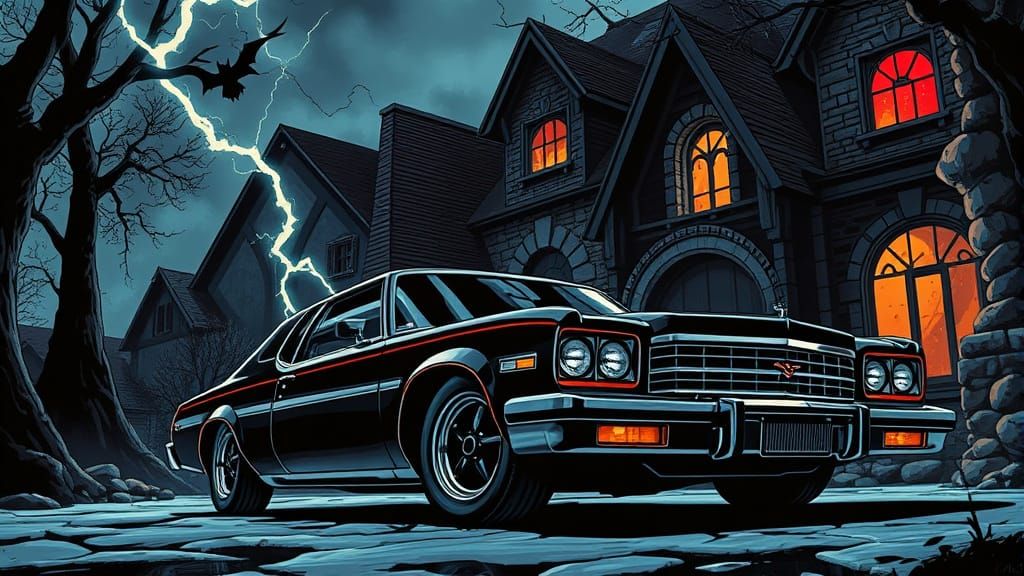 This image shows a menacing car parked outside a comic book villain's lair. Dramatic shadows and lightning create tension in this scene rendered in a smooth, comic book art style.