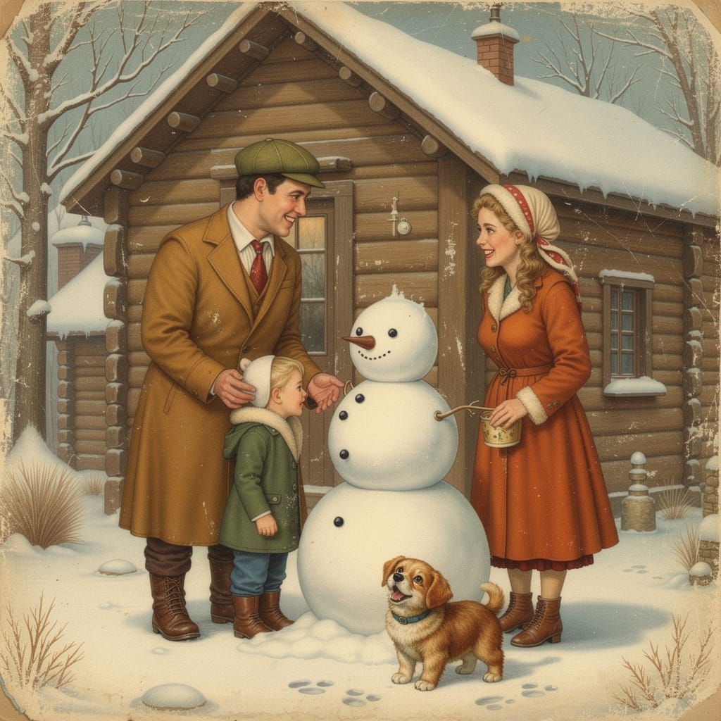 A vintage 1940s family joyfully constructs a snowman outside a rustic cabin, with parents sharing a warm smile. Evokes a nostalgic holiday scene.