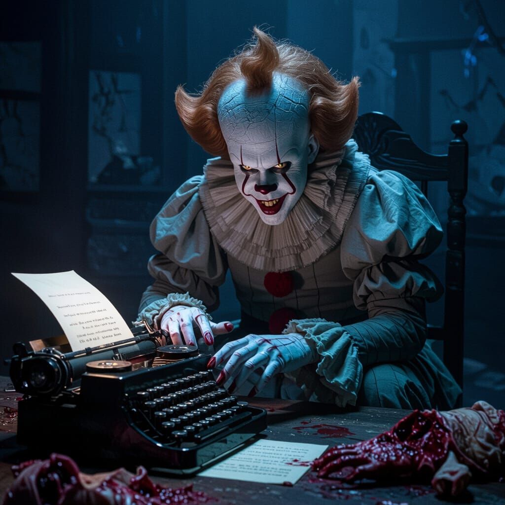 This image shows Pennywise the Clown in a dark room, illuminated by purple and blue light, typing on a vintage typewriter. Eerie shadows and scattered body parts suggest a sinister scene.