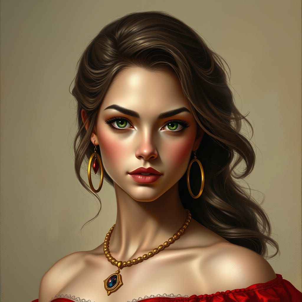 This image shows a beautiful woman with wavy brown hair and green eyes wearing a red dress and gold jewelry. The portrait features soft lighting, detailed textures, and warm colors in a realistic fantasy art style.