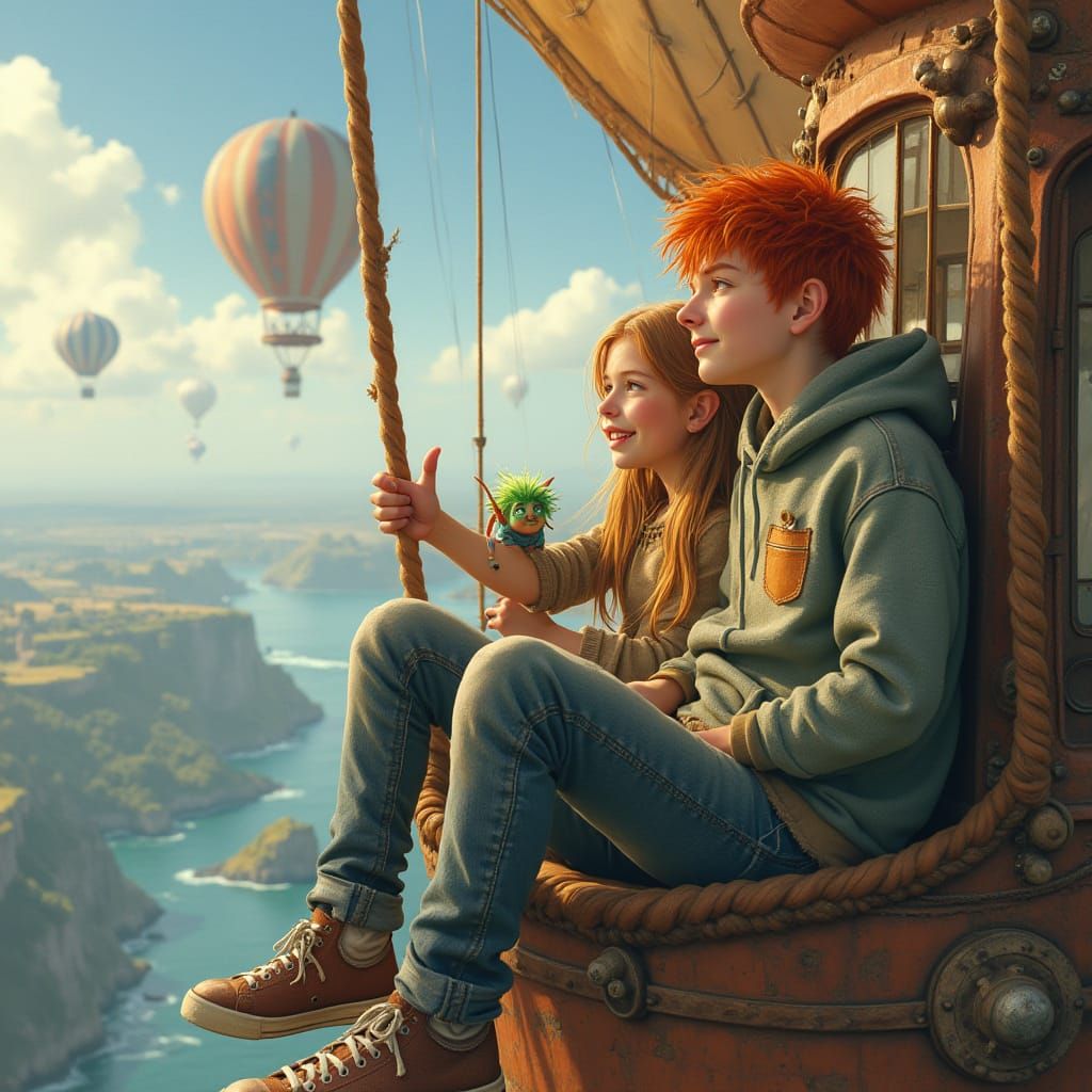 This image depicts a vintage dirigible gently swaying in the breeze, carrying two teenagers, Ron and Eila, above a fantastical world of floating islands, soft clouds, and shimmering waterfalls. The scene is reminiscent of Hayao Miyazaki's whimsical style, with a playful goblin adding a touch of magic to ...