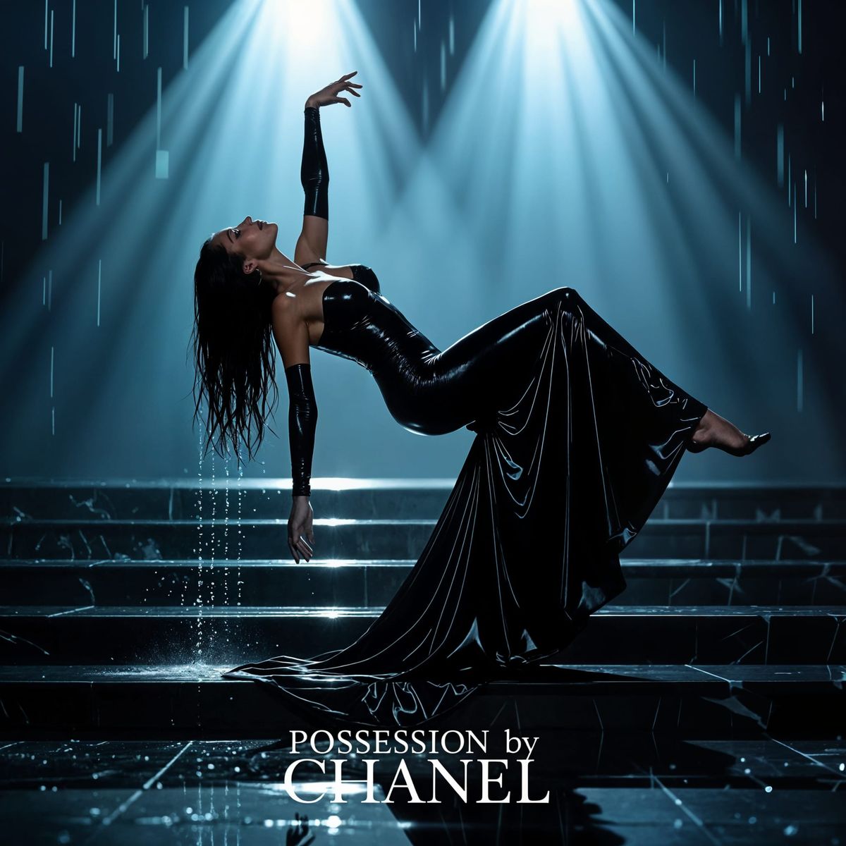 This AI-generated image showcases the POSSESSION by Chanel perfume bottle, presented in a sophisticated and alluring advertising style.