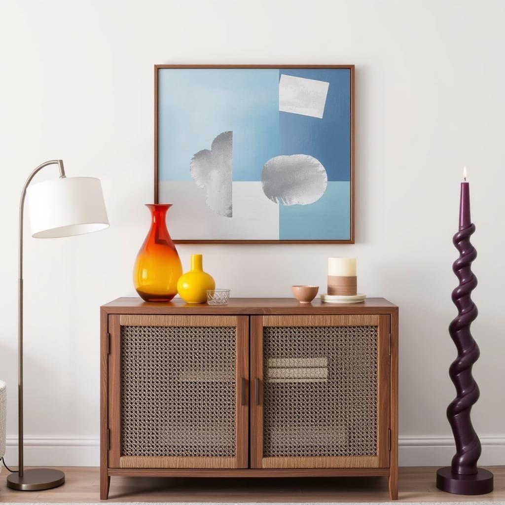 This image showcases a calming, modern living room with a neutral color palette, featuring a wooden cabinet with a wicker texture and glass doors, surrounded by eclectic decorative accents and a stunning abstract artwork with a soothing blue background and geometric shapes.