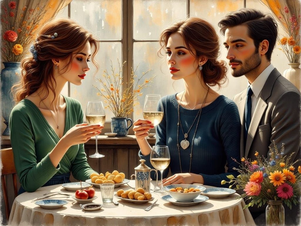 A warm family dinner scene in a Manhattan apartment, blending vibrant ink and elegant lines, with a young woman and her parents enjoying a home-cooked meal together