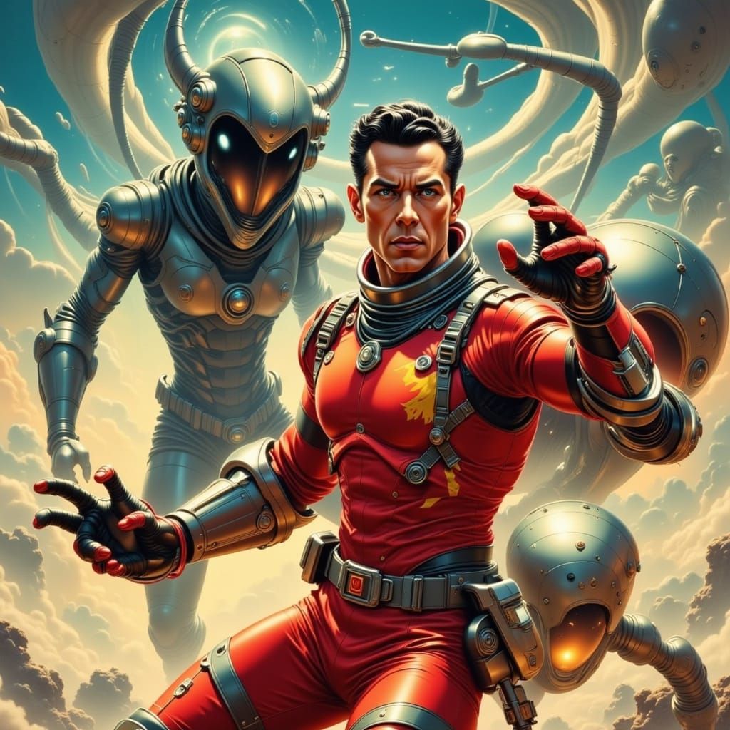 A striking image of a light-skinned man in a red and gray spacesuit operating a mechanical arm. This vintage science fiction scene is depicted with vibrant colors and dramatic action in a vintage-futurism aesthetic.