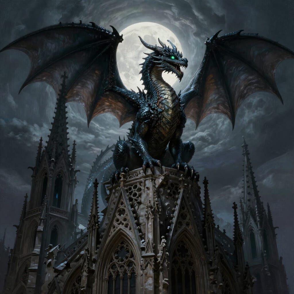 A majestic ancient dragon with obsidian scales rests on a gothic cathedral spire under ethereal moonlight. Highly detailed digital art with atmospheric lighting and dramatic shadows.