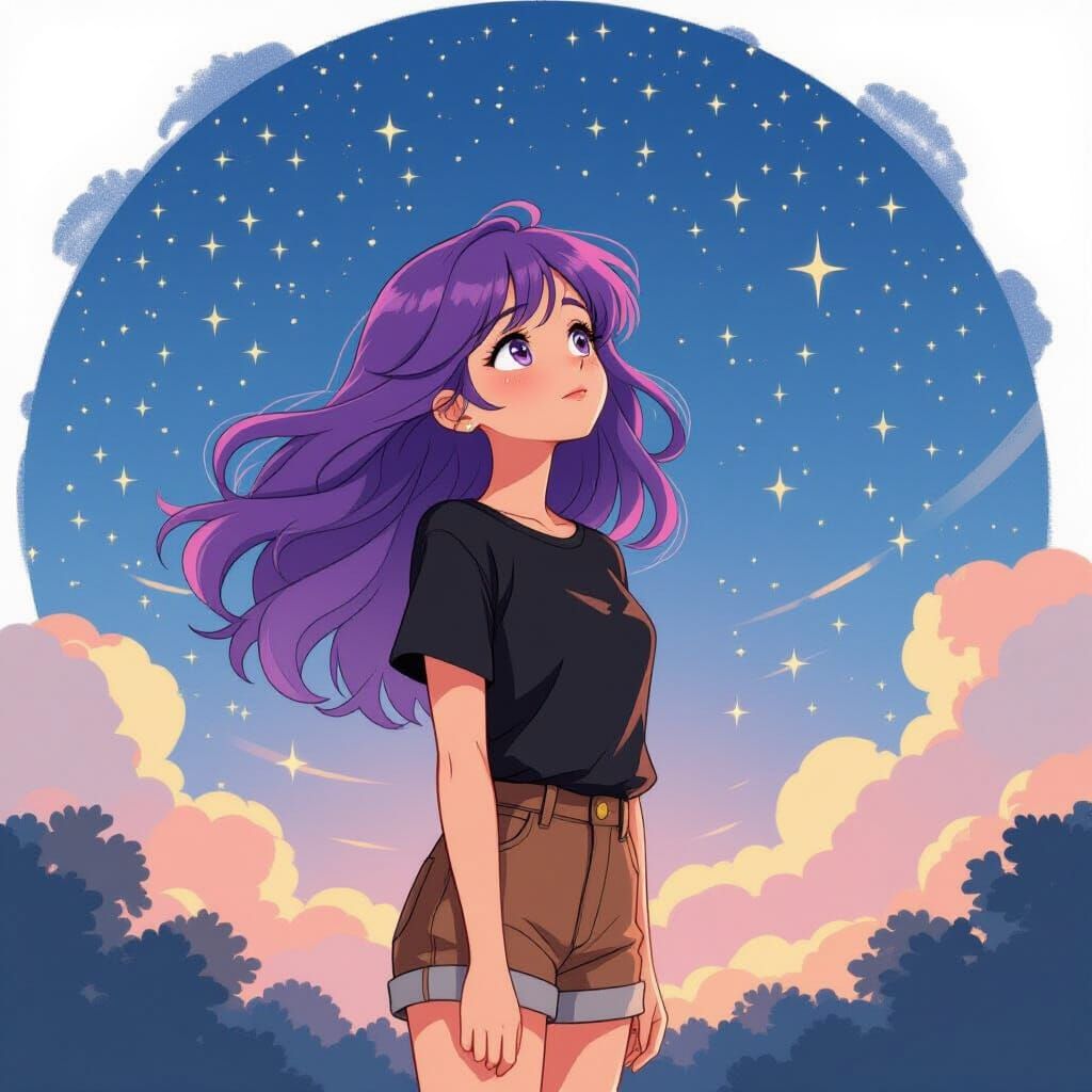 A fantasy illustration of a girl with purple hair looking at the night sky. The image evokes a whimsical and ethereal style with soft textures and twinkling lights.