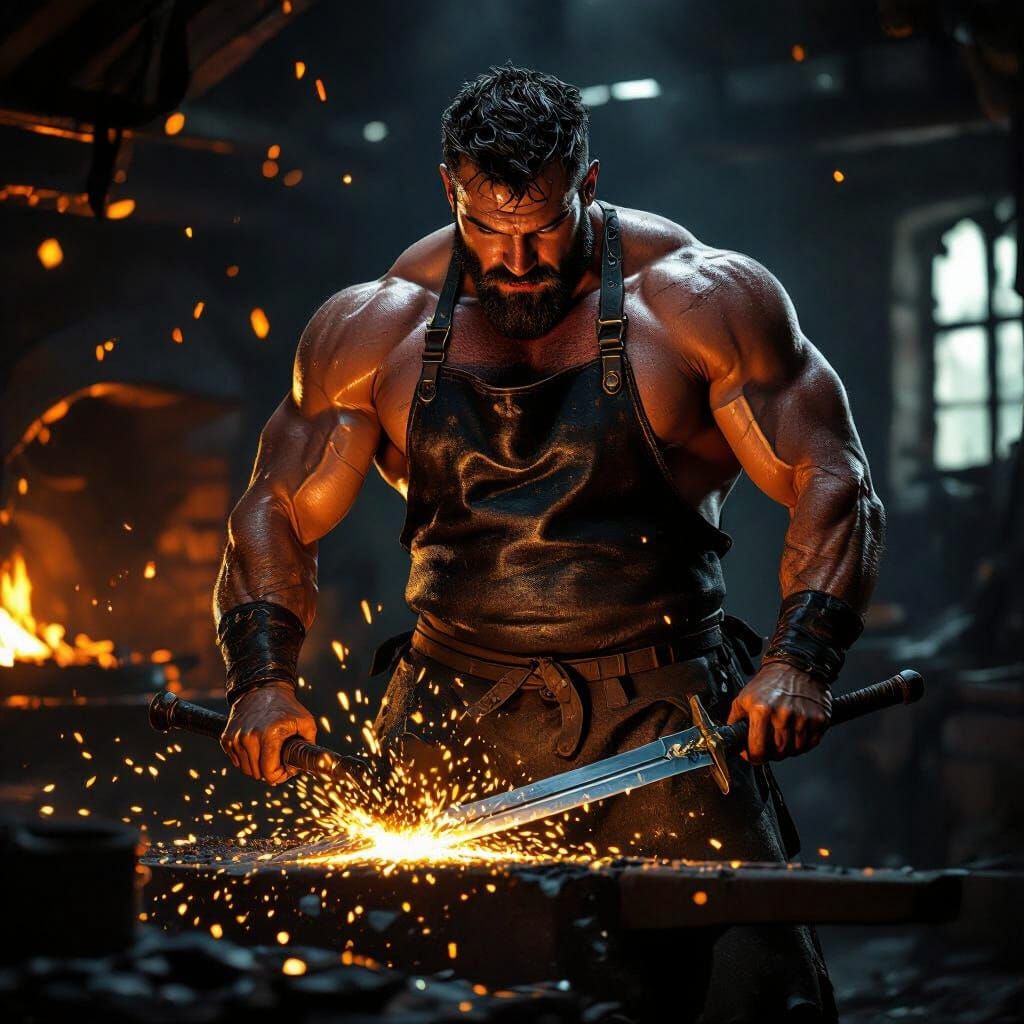 This image shows a blacksmith working at a forge. The scene features dramatic lighting and shadows, reminiscent of a hyperrealistic digital painting with dynamic energy.