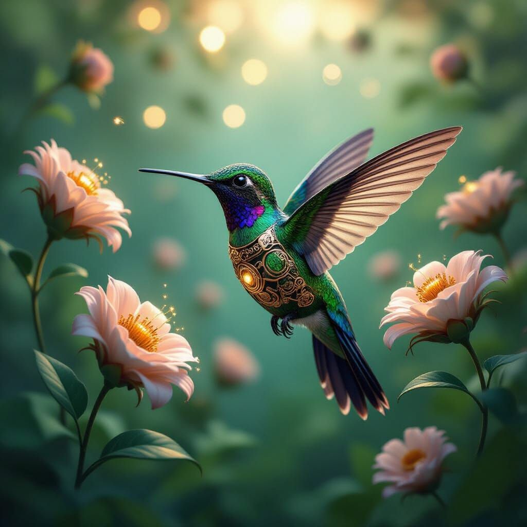 A vibrant image shows a bioluminescent hummingbird with mechanical wings in a whimsical garden. The scene is filled with clockwork flowers and soft ethereal light, in a steampunk aesthetic.