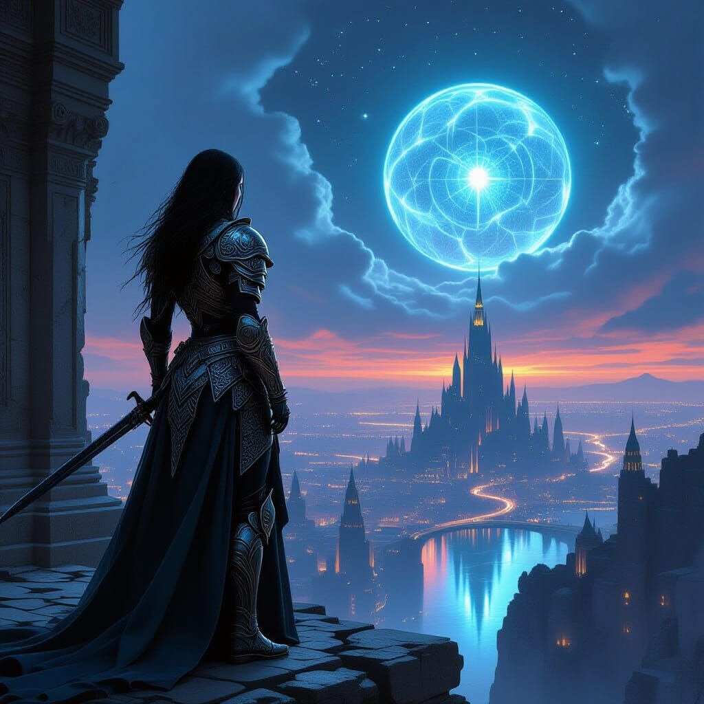 A lone warrior in detailed armor stands on a crumbling citadel. Below, a neon cyberpunk city reflects alien constellations in a dark, moody digital painting. The art style evokes hyperrealism with dramatic lighting.