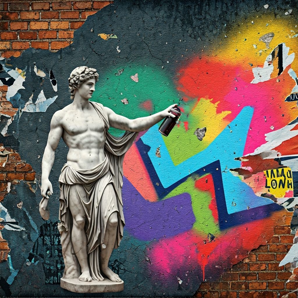 This surreal digital collage shows a classical statue creating vibrant graffiti on a decaying brick wall, blending ancient art with modern street culture.