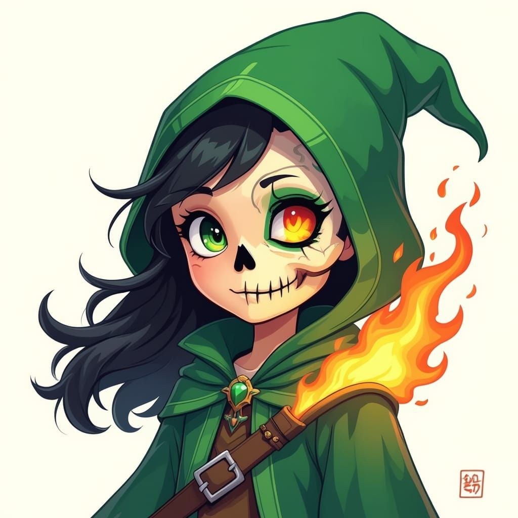 This image depicts a young girl reaper with a skull face, half of which is engulfed in flames. The artwork features envy colors and a style reminiscent of Sly Cooper.
