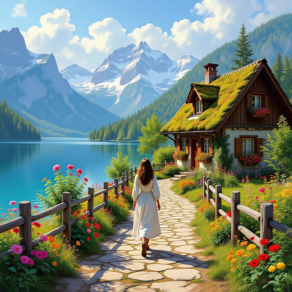 This image shows a peaceful woman strolling towards a quaint cottage adorned with flowers, situated beside a serene blue lake and framed by snow-capped mountains and lush forests, realized in a romantic landscape style.