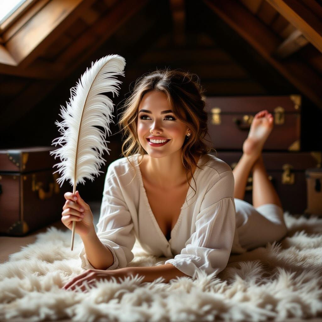 A charming image shows a young woman relaxing in a sunlit attic. She's surrounded by vintage items, captured with a soft, intimate focus reminiscent of classical portraiture and whimsical illustration.