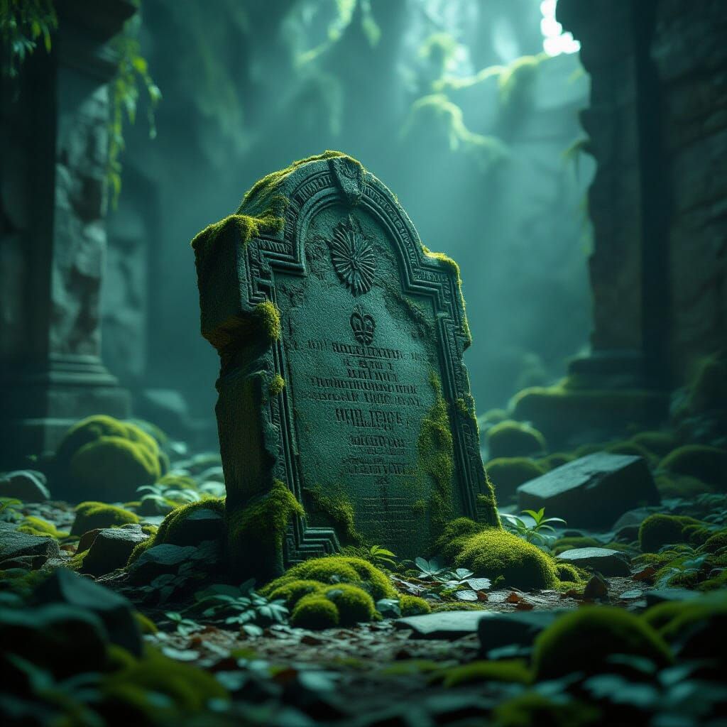 This image showcases an ancient, moss-covered artifact discovered within forgotten ruins. Ethereal lighting highlights decaying textures and dramatic shadows, evoking a sense of melancholic mystery and grandeur.