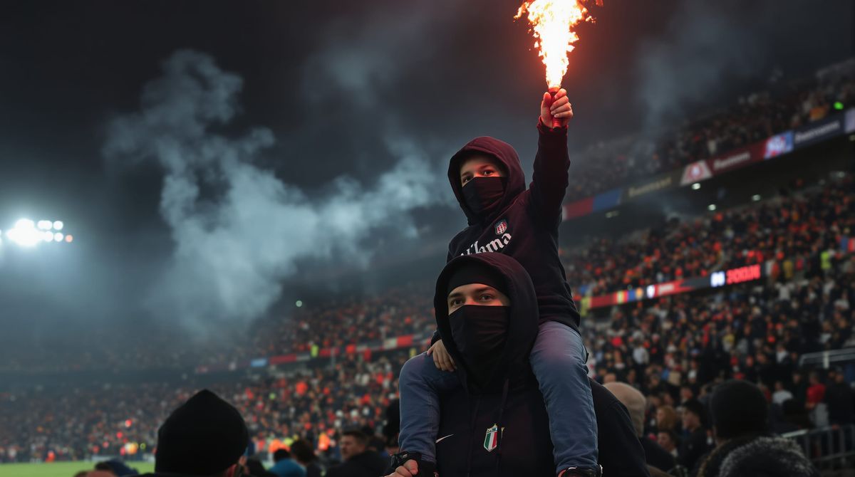 This ultra-realistic photograph captures a father carrying his son on his shoulders in a crowded football stadium. The son triumphantly holds a lit flare, illuminating the passionate crowd.