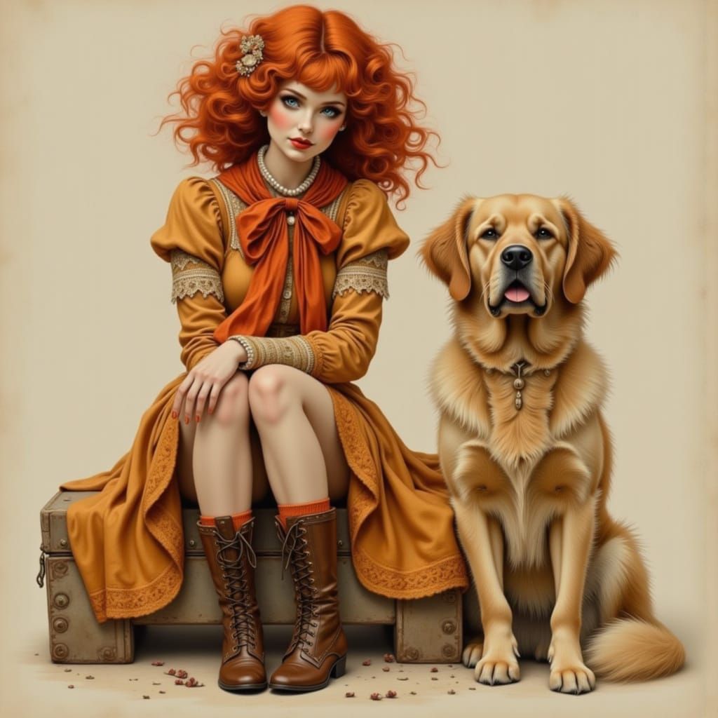 This oil painting depicts a red-haired woman with voluminous curls, dressed in vintage attire with an orange scarf. She sits beside a large, fluffy dog, evoking a whimsical atmosphere.