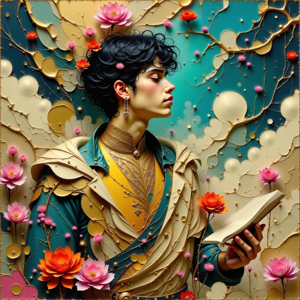 A surreal image of a contemplative man in embroidered clothing amid swirling clouds. This captivating piece blends baroque realism with cubist and abstract elements, using bold textures and symbolic motifs.