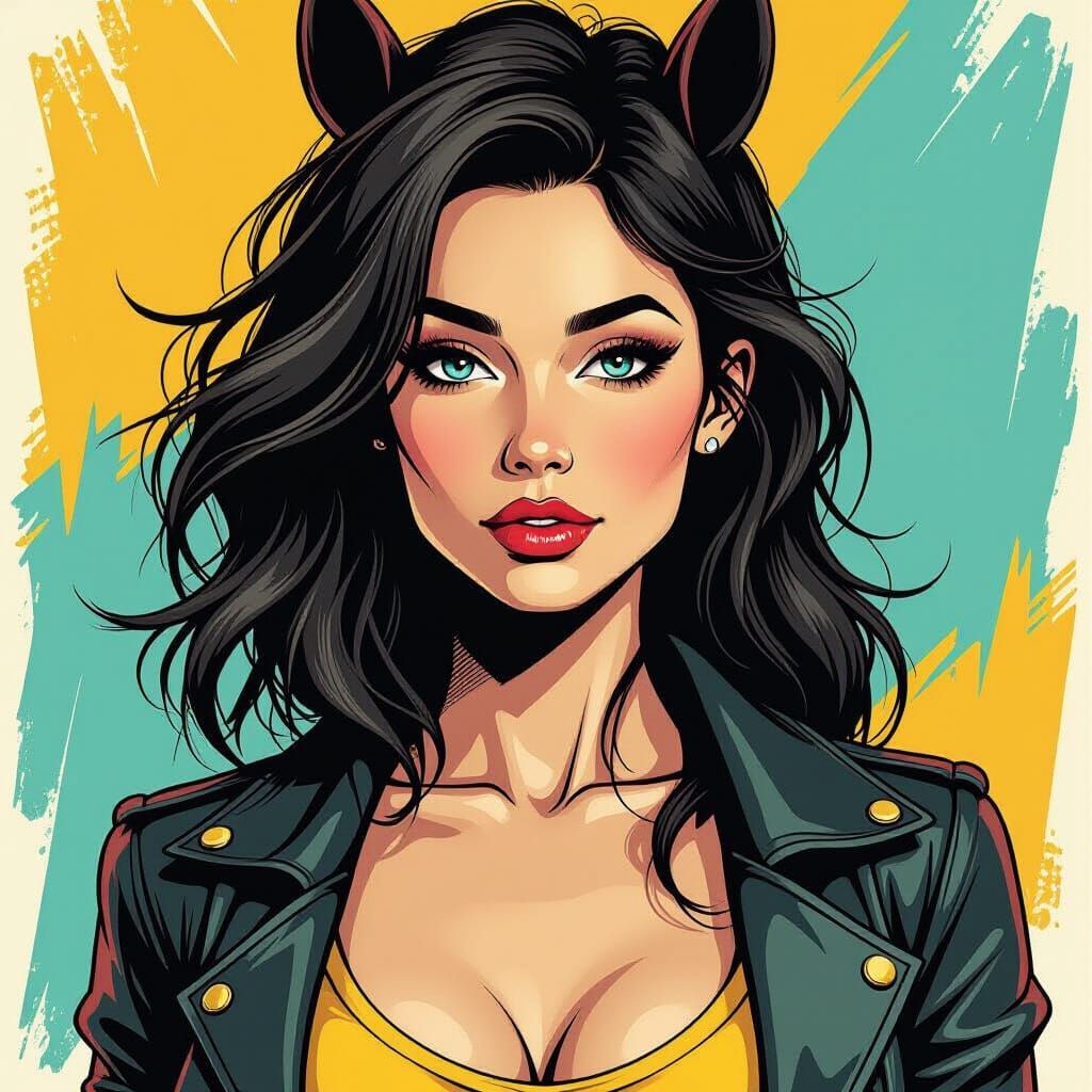 A striking close-up portrait of a hybrid woman-horse figure, rendered in a dynamic, high-contrast comic book aesthetic with bold lines and expressive textures.