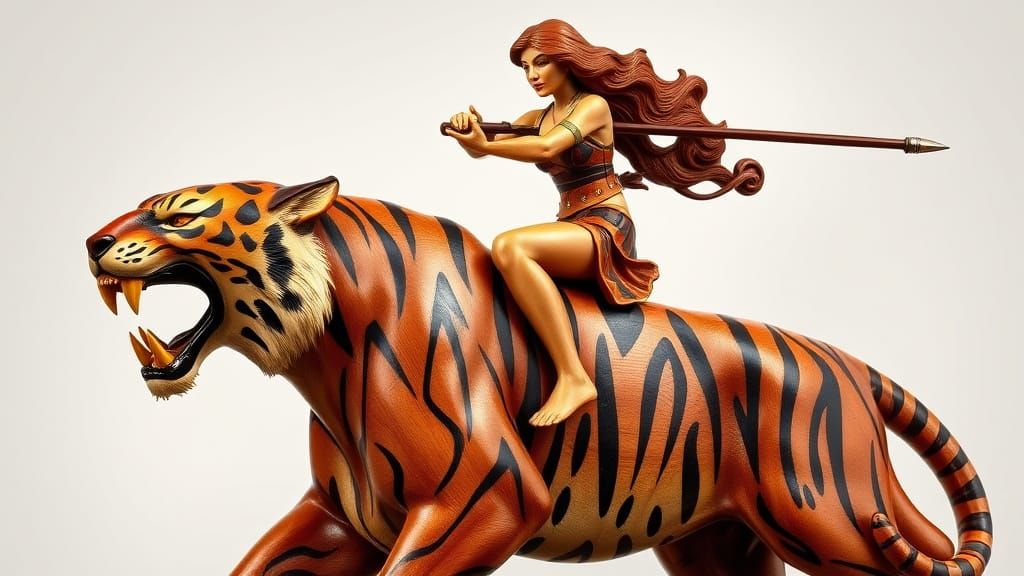 A detailed wooden sculpture of a huntress on a saber-toothed tiger. The colored wood grain is highlighted in this artistic sculpture reminiscent of inlaid wood.