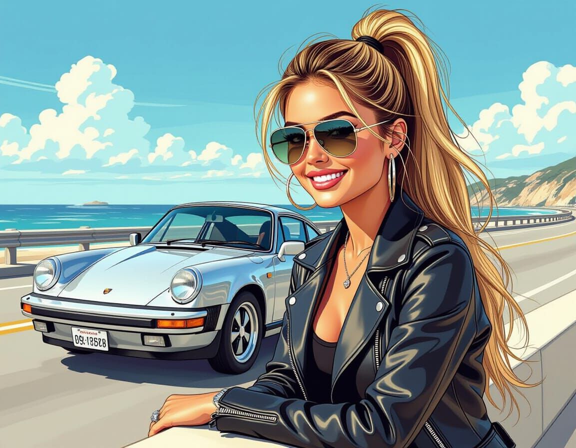 This image shows a blonde woman in aviator sunglasses smiling and leaning against a silver Porsche 911. The art style is reminiscent of a vibrant hand-drawn color comic.