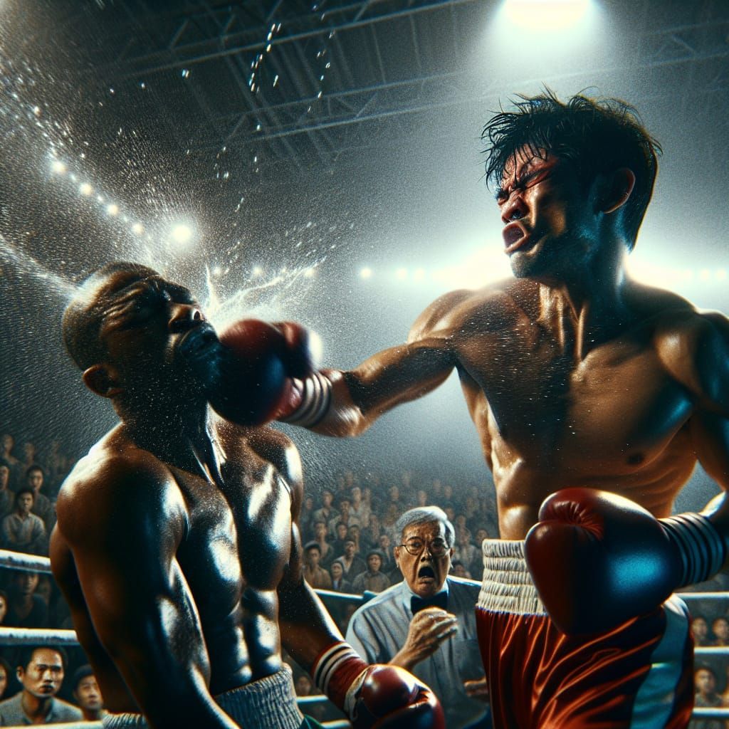 This image shows a chaotic boxing match scene. A South Asian boxer's punch accidentally knocks out the referee instead of his Black opponent, amidst a shocked crowd. The image is styled as a dramatic cinematic film still.