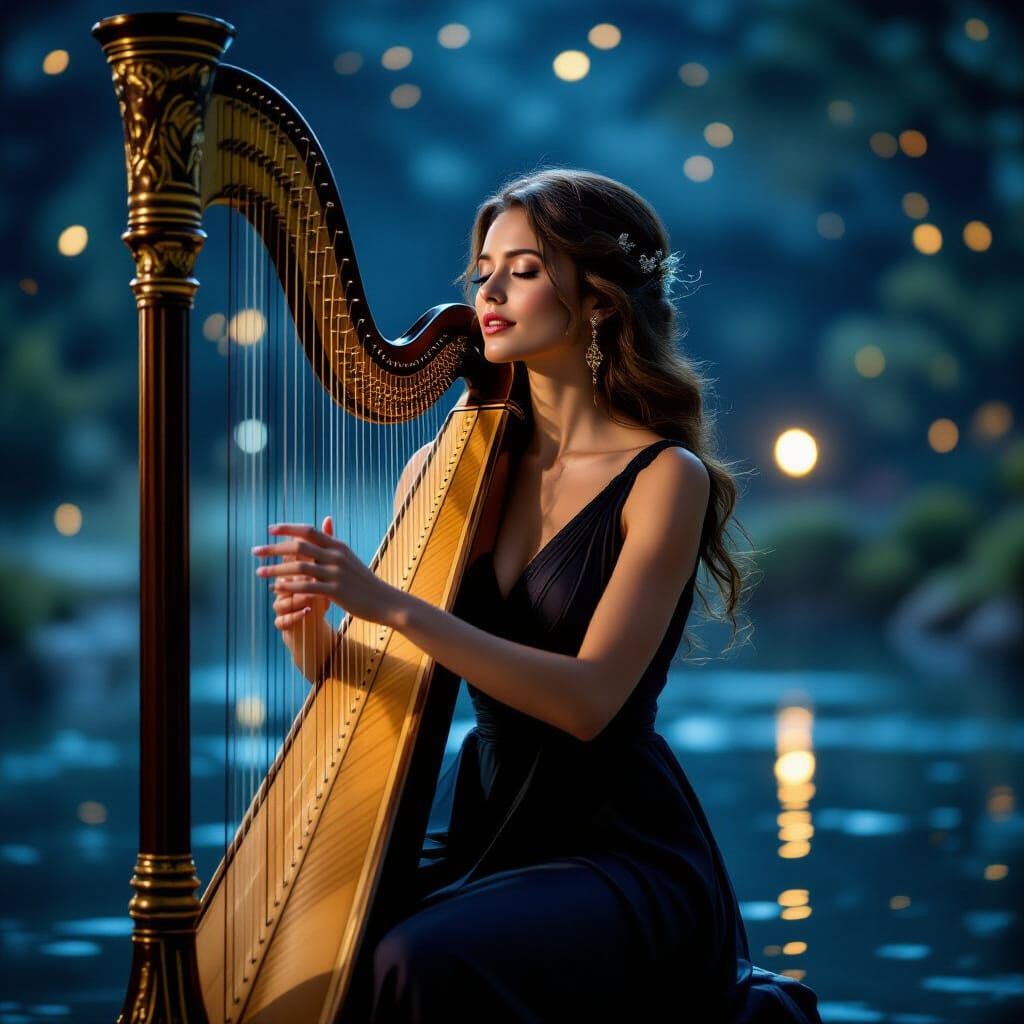 This image shows an ethereal woman playing a harp and singing in the night. Golden music notes float around her as she performs, illuminated against her dark dress.