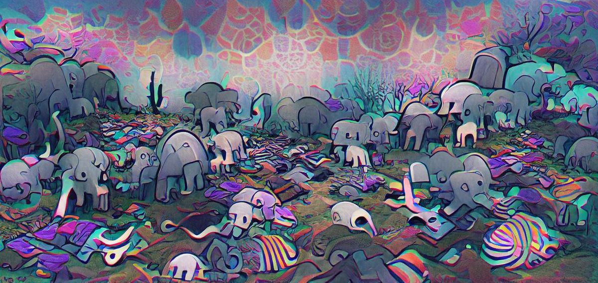 This image depicts a psychedelic elephant graveyard. The vibrant colors and surreal style create an otherworldly atmosphere, with a dreamlike quality.