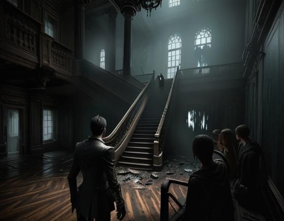 This image depicts a group of teenagers cautiously exploring a dilapidated house, unaware of a haunting figure observing them from the top of a grand staircase. The scene is rendered as a detailed painting with dynamic lighting.