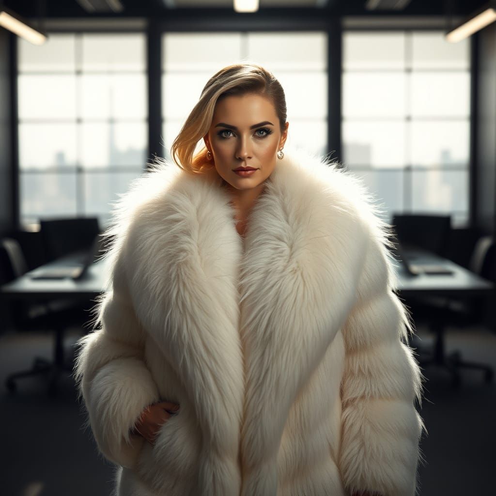 This image showcases a hyperrealistic depiction of a luxurious white fox fur coat on a strong female executive in a modern office. Dramatic lighting highlights the fur's texture and sheen, evoking high-fashion photography.