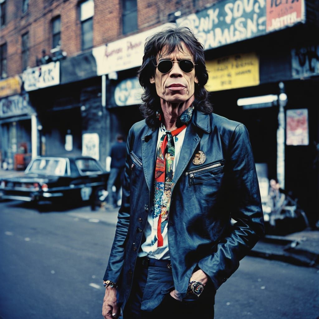 A digital rendering of Mick Jagger in punk street fashion. The image captures a sinister aesthetic, emphasizing bold colors and raw energy.