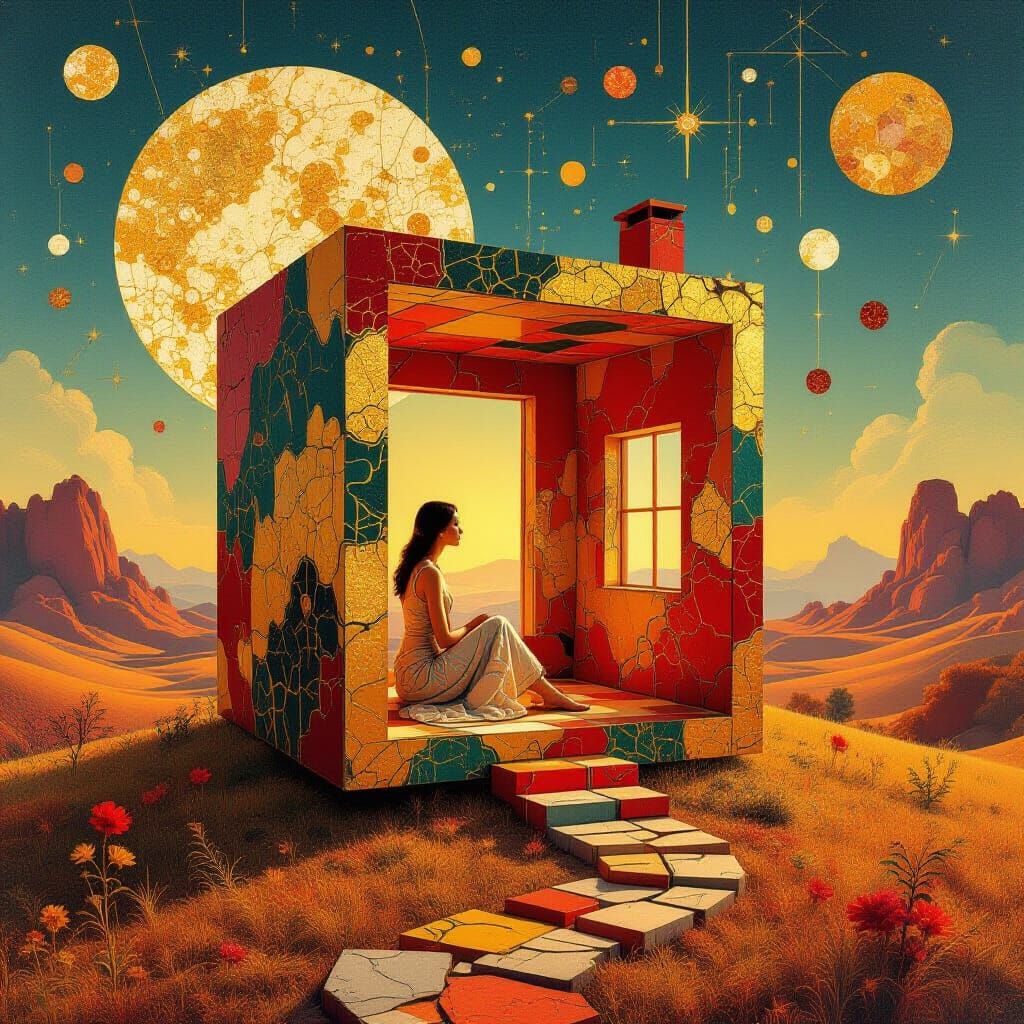 A woman sits in an abstract house with kintsugi details, set against a surreal landscape. This highly detailed image features fractal patterns, geometric and organic lines, and expressive brushstrokes in a mixed-media style.