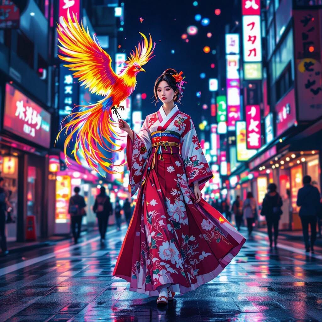 This image shows a young South Korean woman in a hanbok walking down a busy Tokyo street while holding a phoenix. The picture features dynamic brushstrokes and vibrant, exaggerated colors.