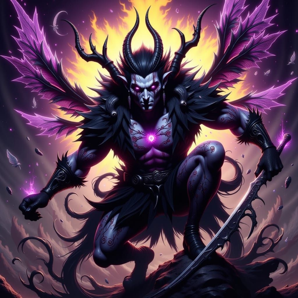 A brooding fae with dark, gritty tattoos and piercing eyes, exudes eerie confidence in a battle-ready stance, surrounded by vibrant purple and yellow hues in a swirling vortex of color, with intricate, hyper-realistic details and cinematic lighting