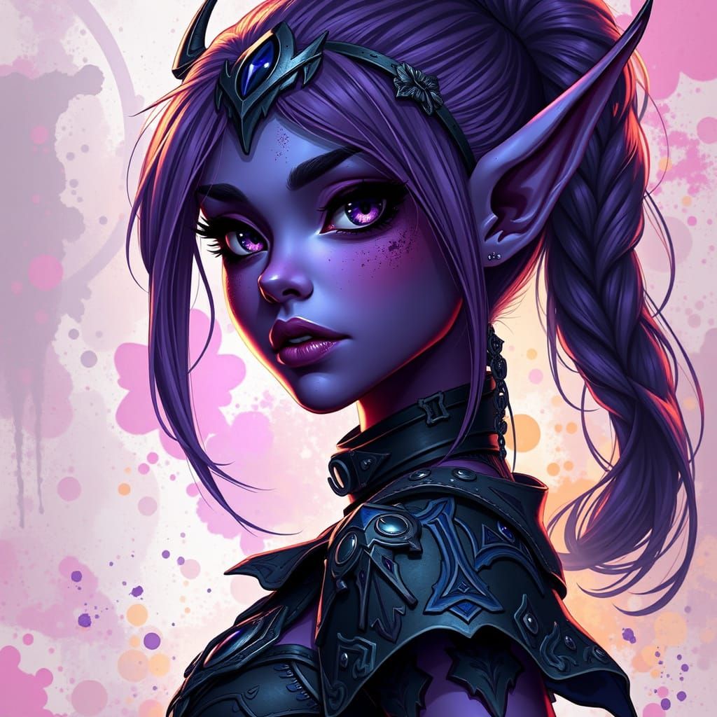 This image shows a purple-skinned night elf woman in a goth outfit. The hyperrealistic digital art features intricate details, dramatic lighting, and a colorful background.