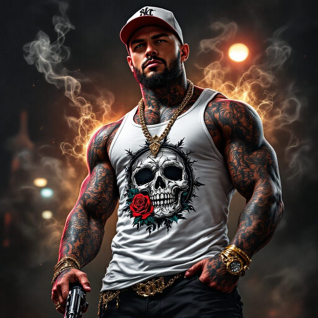 A hyperrealistic image of a muscular gangster with intricate facial and body tattoos, wearing gold jewelry and knuckle dusters, holding a pistol. Dramatic lighting highlights city lights and smoke.