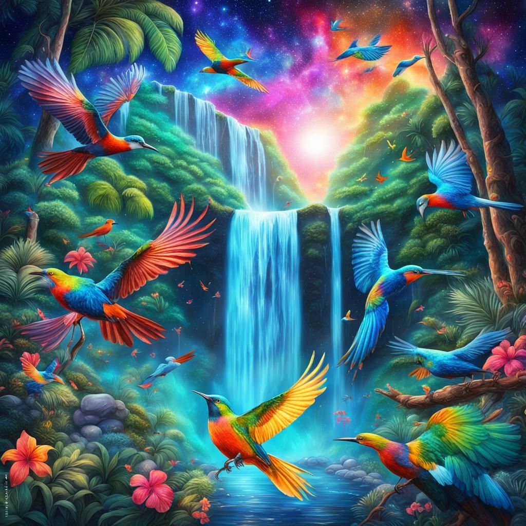 A vibrant image of a waterfall cascading through a tropical forest, complemented by colorful birds. The artwork is rendered in a holographic, cosmic style, reminiscent of mixed media illustrations.