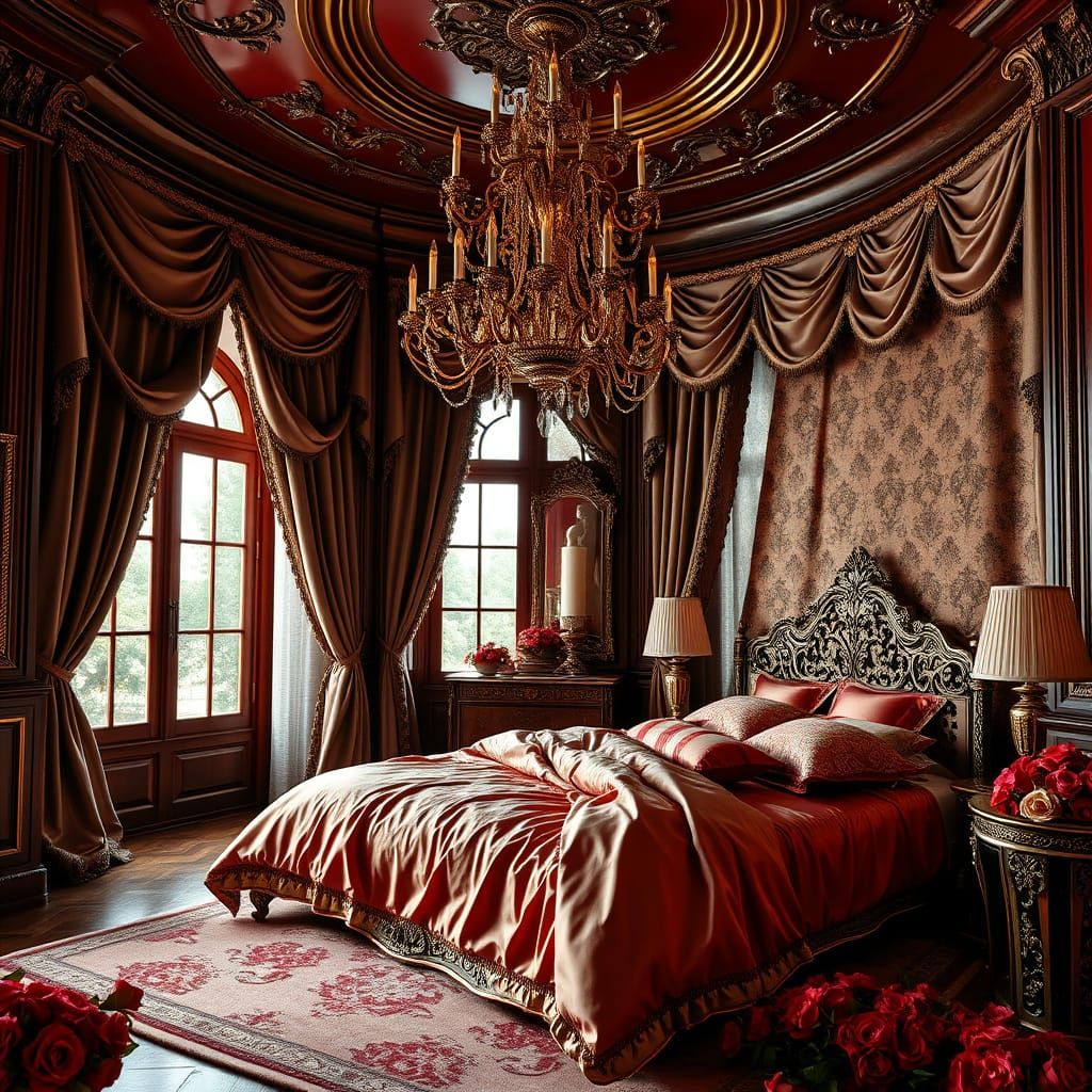 A luxurious baroque bedroom featuring silk sheets, polished wood, and a rich color palette. The room is illuminated by a grand chandelier and bright 3D lighting, in the style of classic old masters.