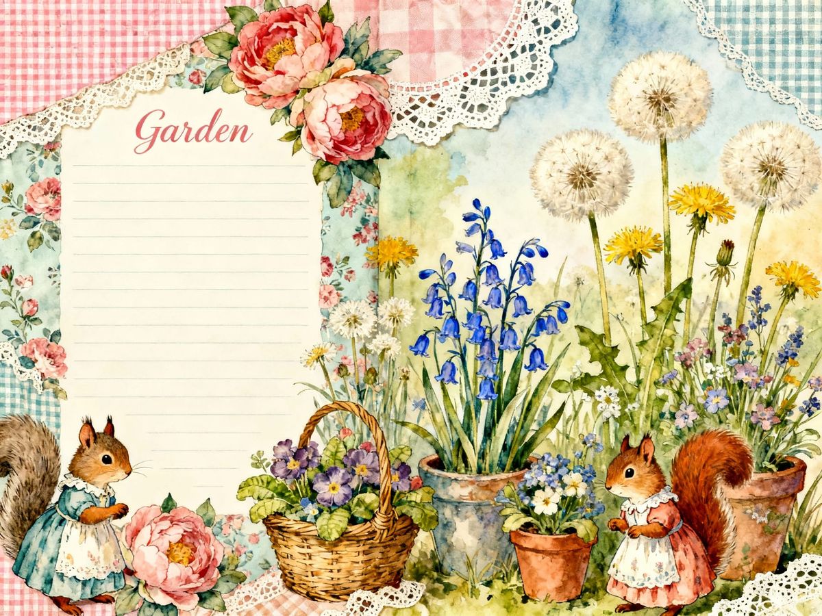 This flat illustration depicts a shabby chic junk journal page adorned with gingham, lace, and various flowers. It features squirrels in dresses, reminiscent of classic children's book illustrations.