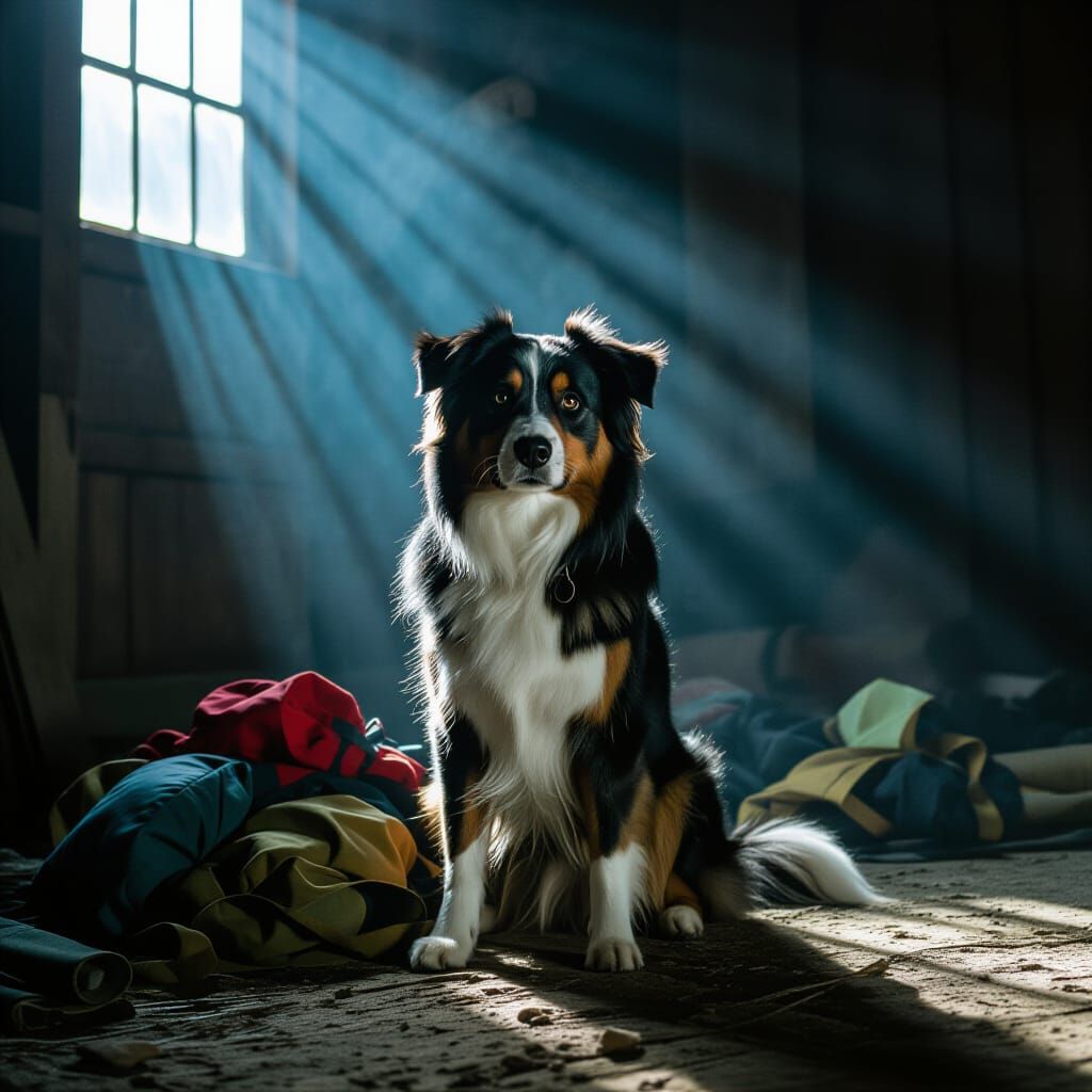 This image shows a dog amidst scattered adventuring gear in a dramatically lit, cinematic scene. The image evokes a filmic quality with its pronounced vignette, heavy grain, and vibrant colors, capturing an atmospheric mood.